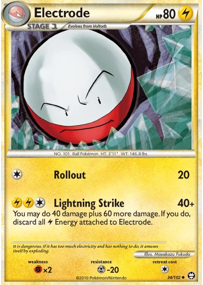 You may do 40 damage plus 60 more damage. If you do, discard all Lightning Energy attached to Electrode.