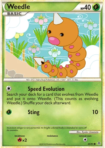Search your deck for a card that evolves from Weedle and put it onto Weedle. (This counts as evolving Weedle.) Shuffle your deck afterward.