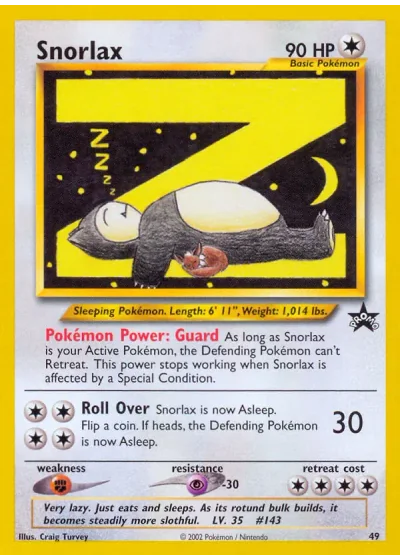 Snorlax is now Asleep. Flip a coin, If heads, the Defending Pokémon is now Asleep.