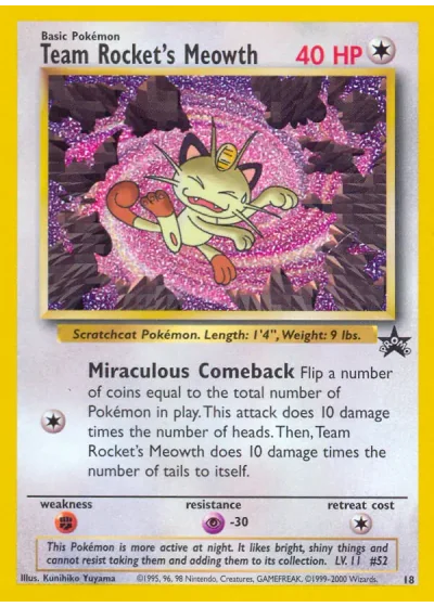 Flip a number of coins equal to the total number of Pokémon in play. This attack does 10 damage times the number of heads. Then, Team Rocket's Meowth does 10 damage times the number of tails to itself.