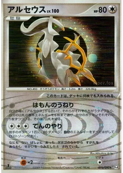 If you have 6 Arceus in play and each of them is a different type, search your deck for up to 6 basic Energy cards. Attach each of those Energy cards to a different Pokémon you have in play. Shuffle your deck afterward.