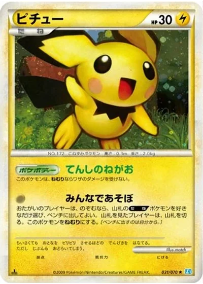 Each player may search his or her deck for as many Basic Pokémon as he or she likes, put them onto his or her Bench, and shuffle his or her deck afterward. (You put your Pokémon on the Bench first.) Pichu is now Asleep.